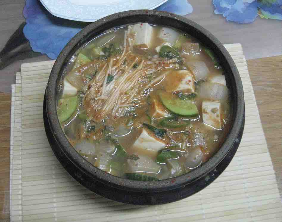 テンジャンを使って、日本の味噌汁と同じように作ります。豆腐、韓国カボチャ(ホバク/호박)、玉ねぎ、えのきだけ、ジャガイモ、白菜の中から少数の材料が入っていることが多く、味付けはあっさりめですが、唐辛子入りで辛くなっている場合もあります。