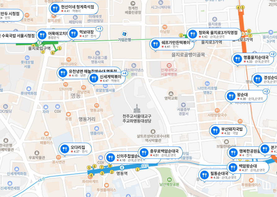 Naver地図で、スンデ(「순대」)と検索すると、地図と一緒にお店の位置が表示されます。それらの粉食やトッポギの店に行けばスンデが食べられますし、その他に、スンデグクのお店なんかが街中にもよくあります!