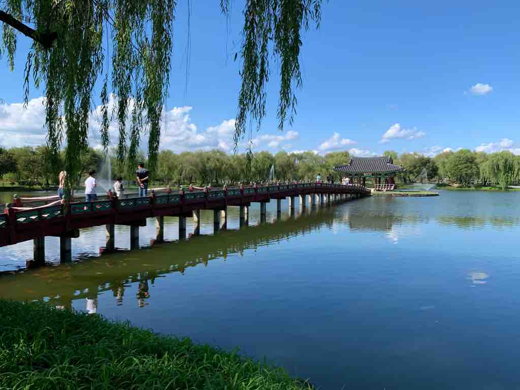 扶蘇山城の南麓には、泗沘城や王宮があったと言われますが、現在は、広大な跡地のみが残っています。さらにその南側にはかつて離宮があって、現在はその離宮の池の庭園「宮南池(クンナムジ/궁남지)」が復元されていますので、ここは扶余の必須コースと言えるでしょう。