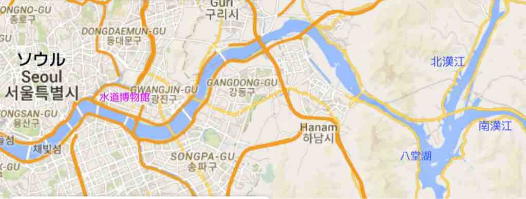 漢江は、ソウル市内を東から西へと流れています。その漢江を東側へ上流に向かって上っていくと、ソウルを抜け東へ10〜15Kmと行った地点に八堂(팔당、パルダン)湖というダム湖があり、そこからさらに上流は北漢江と南漢江とに分かれています。