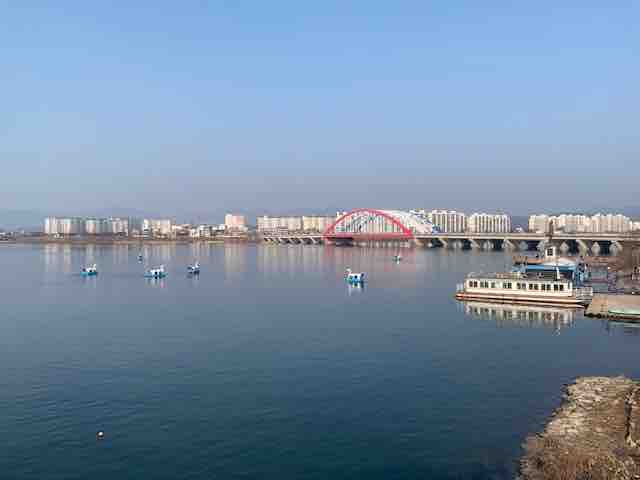ただ、春川市内の北漢江の川幅は、ソウル市の漢江よりも広いです。実はそれもそのはず、そこは衣岩湖(의암호、ウィアムホ)と呼ばれる人工のダム湖でした。
